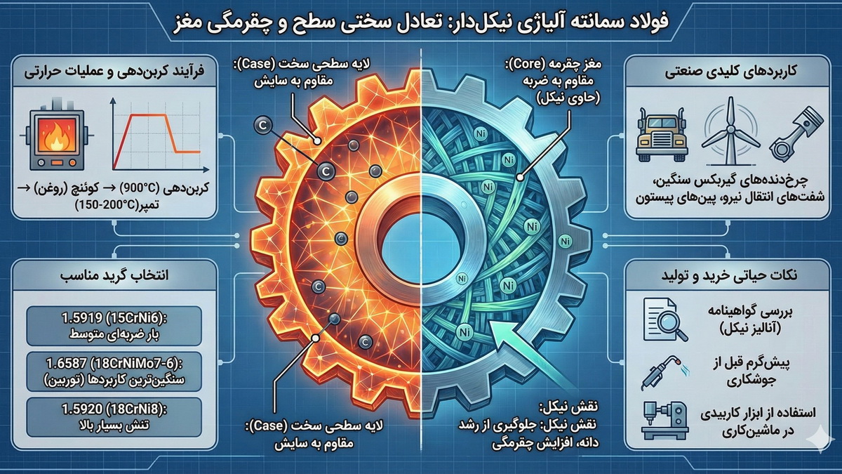 فولادهای سمانته (Case-Hardening Steels) که با عنصر نیکل آلیاژ شده اند، دسته ای خاص از متریال های صنعتی هستند که برای تحمل فشارهای سنگین و مقاومت در برابر سایش سطحی طراحی شده اند. برخلاف فولادهای کربنی ساده که پس از سخت کاری ممکن است دچار تردی شوند، افزودن نیکل به ساختار این فولادها باعث افزایش چقرمگی (Toughness) در مغز قطعه می شود، در حالی که سطح آن همچنان سخت و مقاوم باقی می ماند. این ویژگی دوگانه، یعنی “سطحی ضدسایش و مغزی چقرمه”، کلید شناخت و انتخاب این نوع فولادها در مهندسی مکانیک است.اگر قطعه شما حساسیت بالایی ندارد و صرفاً ضد سایش بودن مهم است، فولاد سمانته معمولی (بدون نیکل) هزینه کمتری دارد.